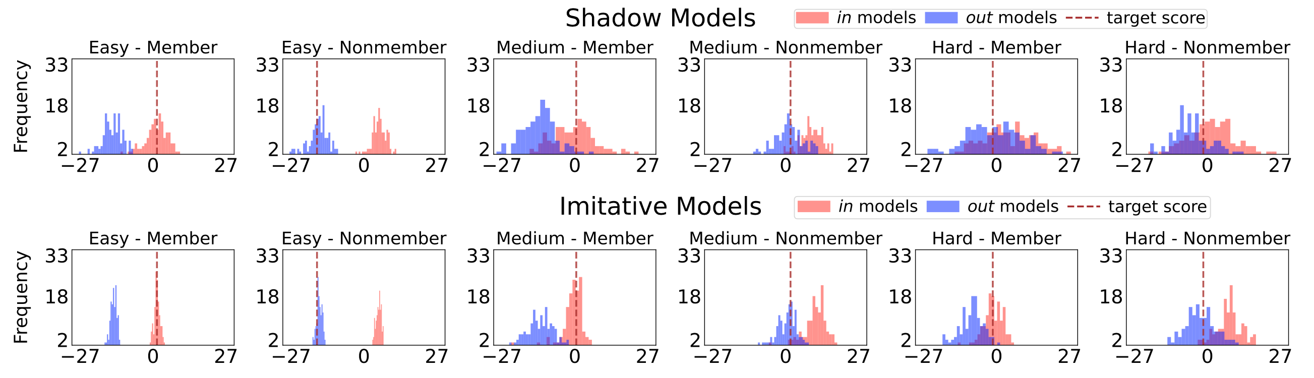 We identify that much of the inefficiency in existing methods comes from their target-agnostic design. Standard shadow models are trained to learn general behavioral distributions, but they are not trained to learn the specific idiosyncrasies of the target model under attack. As a result, shadow models exhibit high predictive variance. As shown in the top row of the figure below, the score distributions for members and non-members derived from shadow models often overlap significantly, especially for “hard” instances. This variance forces attackers to train hundreds of models just to statistically average out the noise.