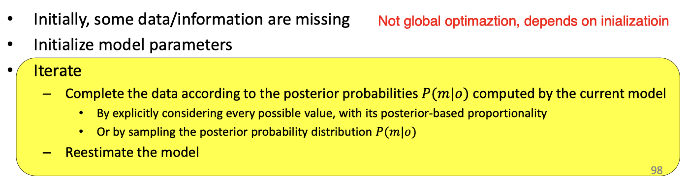 - EM: An iterative technique to estimate probability models for data with missing components or information